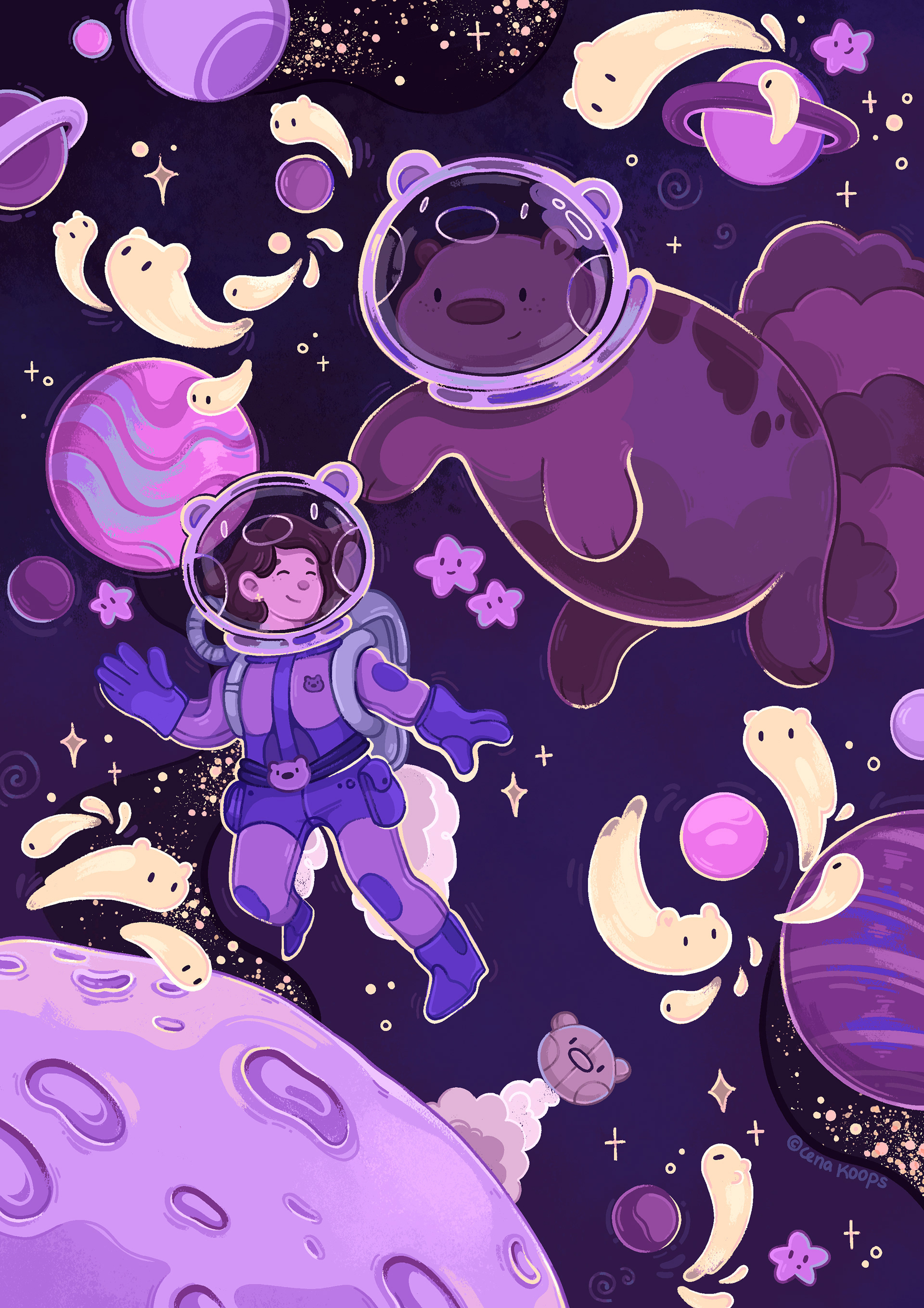 Für das OC Fashion Zines zeichnet jede*r Teilnehmende Künstler*in/Illustrator*in seinen eigens kreierten Charakter mit Mode passend zu dem jährlich wechselndem Thema. Dieses Jahr war das Überthema "Galaxy", also habe ich meinen OC Biberbär und seine Mechaniker Freundin im Weltall, in einem bärig, süßem Raumanzug gemalt.